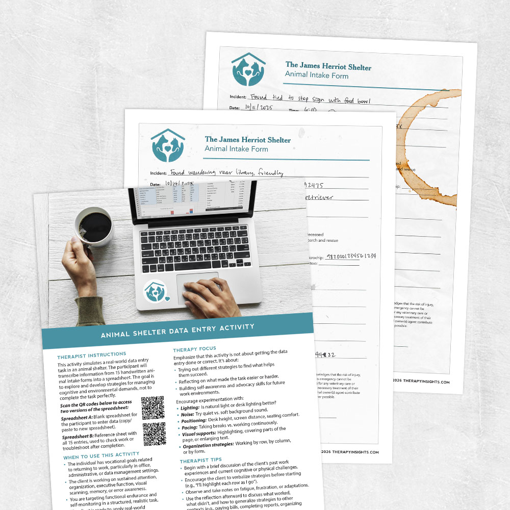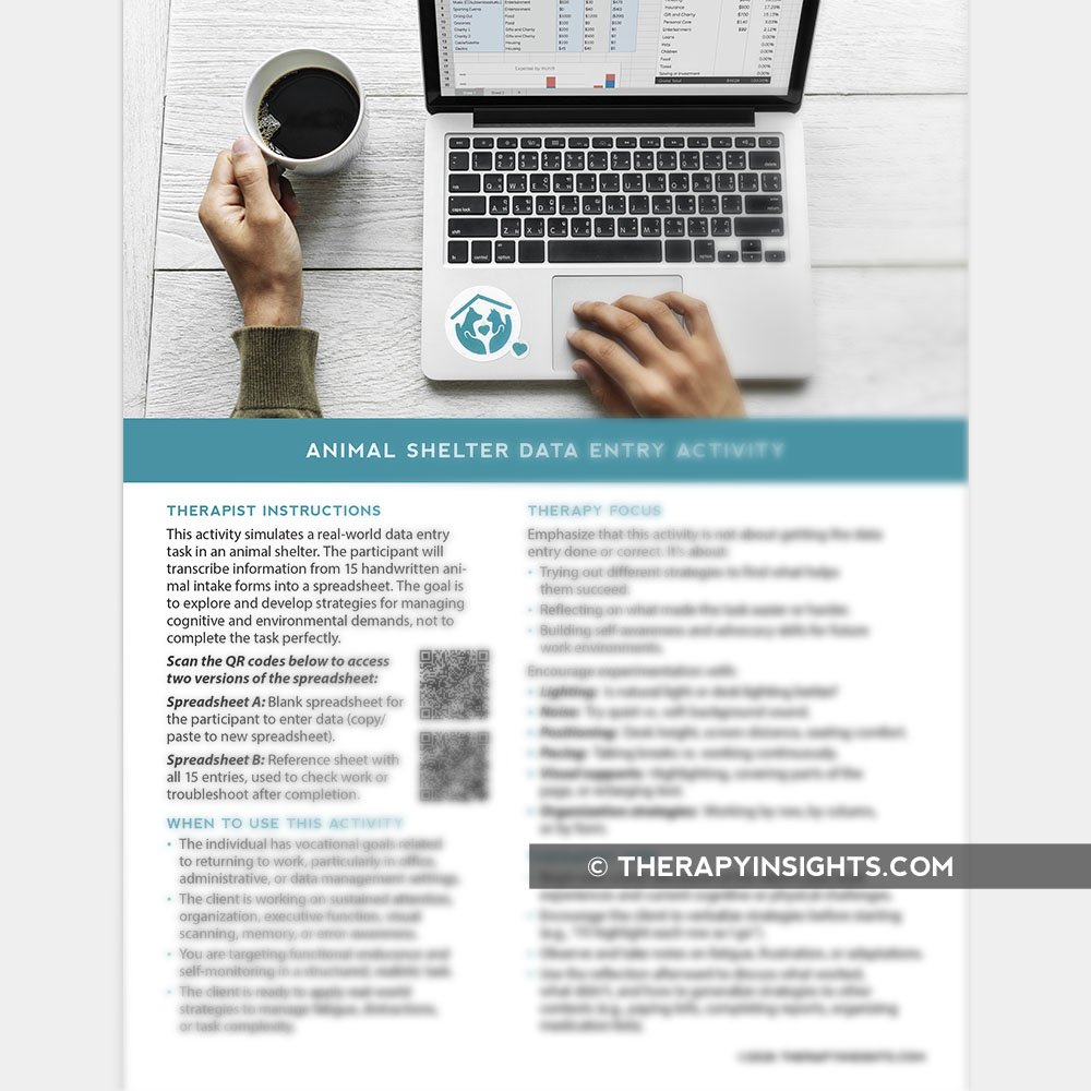 ADLs/IADLsBrain InjuryProgressive Neurological ConditionsStrokeThis functional data entry activity helps clients preparing to return to work practice organization, attention, and self-monitoring within a realistic context. Use it to explore effective strategies for managing distractions, fatigue, and task complexity while building confidence and insight into work-related cognitive demands.