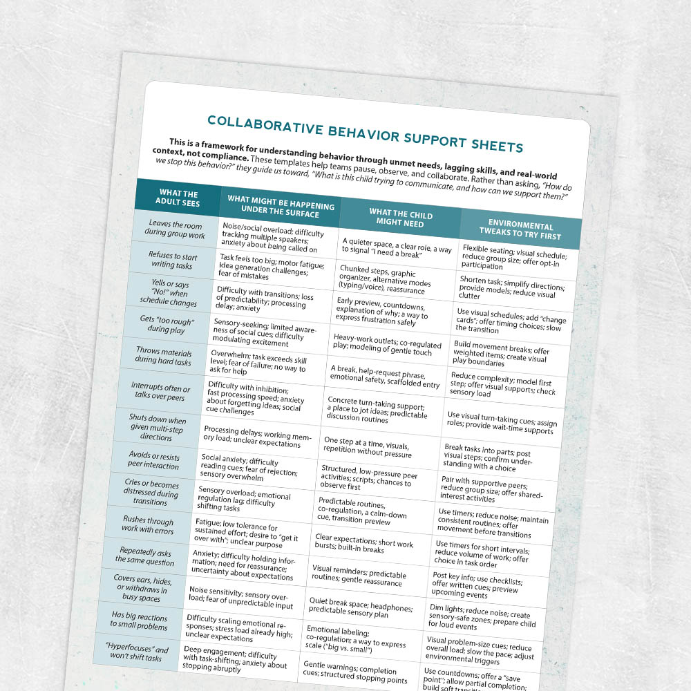AutismExecutive FunctionLanguage DevelopmentSensoryThis resource reframes challenging behaviors as clues to unmet needs, lagging skills, and environmental mismatches, helping teams move beyond compliance-based approaches. The table format provides a practical way to collaborate with families and schools, identify what’s happening under the surface, and choose supportive strategies that honor each child’s autonomy and nervous system.