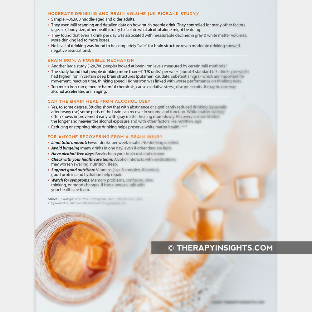 Daviet, R., Aydogan, G., Jagannathan, K., Spilka, N., Koellinger, P. D., Kranzler, H. R., Nave, G., & Wetherill, R. R. (2022). Associations between alcohol consumption and gray and white matter volumes in the UK Biobank. Nature Communications, 13(1), Article 1175. Topiwala, A., Wang, C., Ebmeier, K. P., Burgess, S., Bell, S., Levey, D. F., … & Nichols, T. E. (2022). Associations between moderate alcohol consumption, brain iron, and cognition in UK Biobank participants: Observational and Mendelian randomization analyses. PLOS Medicine, 19(7), e1004039. Mewton, L., Visontay, R., Hughes, G., Browning, C., Wen, W., Topiwala, A., … & Sachdev, P. (2024). Longitudinal alcohol-related brain changes in older adults: The Sydney Memory and Ageing Study. Addiction Biology, 29(5), e13402. Topiwala, A., Allan, C. L., Valkanova, V., Zsoldos, E., Zammitt, N. L., & Ebmeier, K. P. (2017). Moderate alcohol consumption as risk factor for adverse brain outcomes and cognitive decline: longitudinal cohort study. BMJ, 357, j2353.