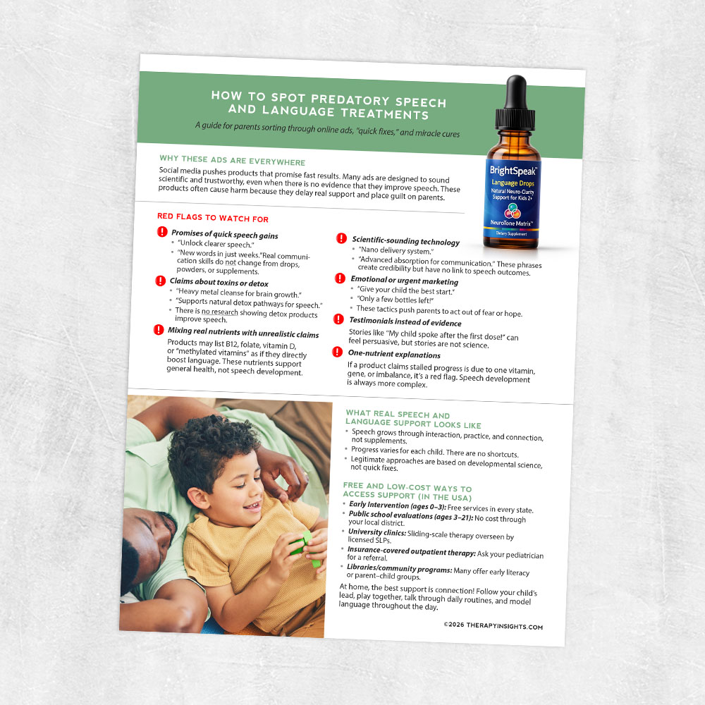 Apraxia of SpeechArticulation and PhonologyAutismExecutive FunctionFluencyLanguage DevelopmentThis resource equips parents with tools to spot misleading “quick fix” speech products and understand why these claims can feel so convincing. Use it to support informed decision-making and protect families from false hope and unnecessary costs.
