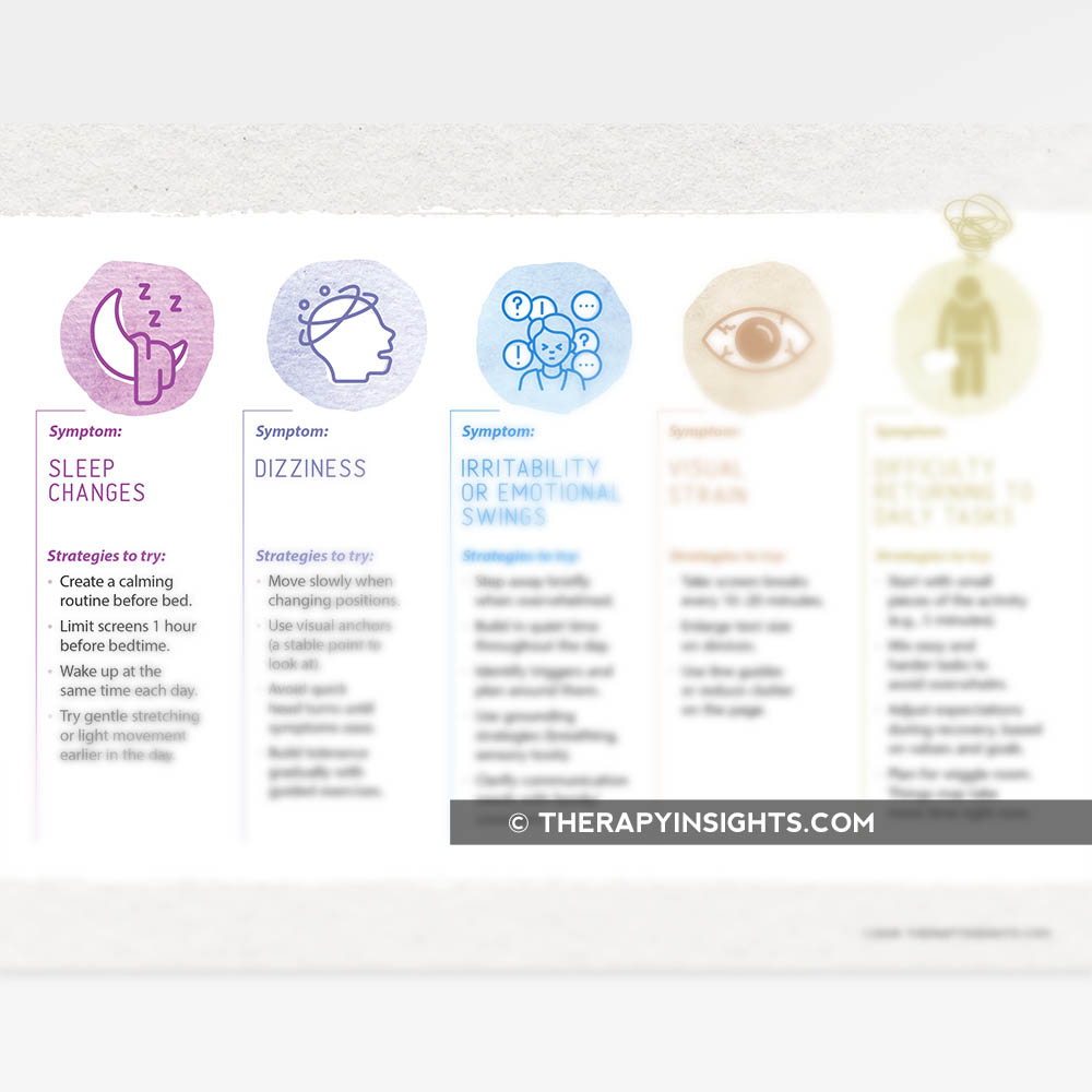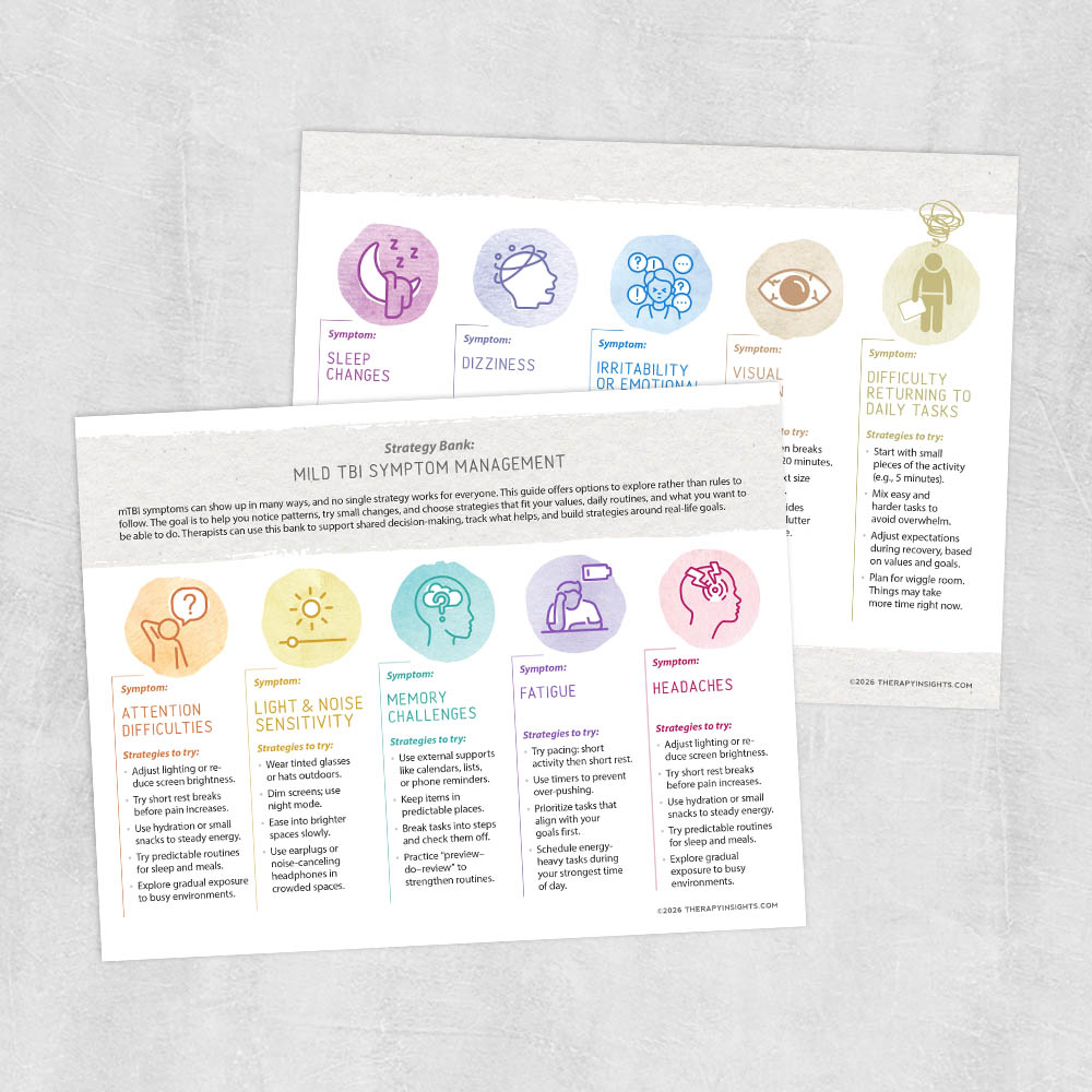 Brain InjuryThis strategy bank helps people with mTBI explore symptom-management options in a way that aligns with their values, daily routines, and goals. Use it to guide shared decision-making, track what works, and build personalized plans that support meaningful participation in real life.