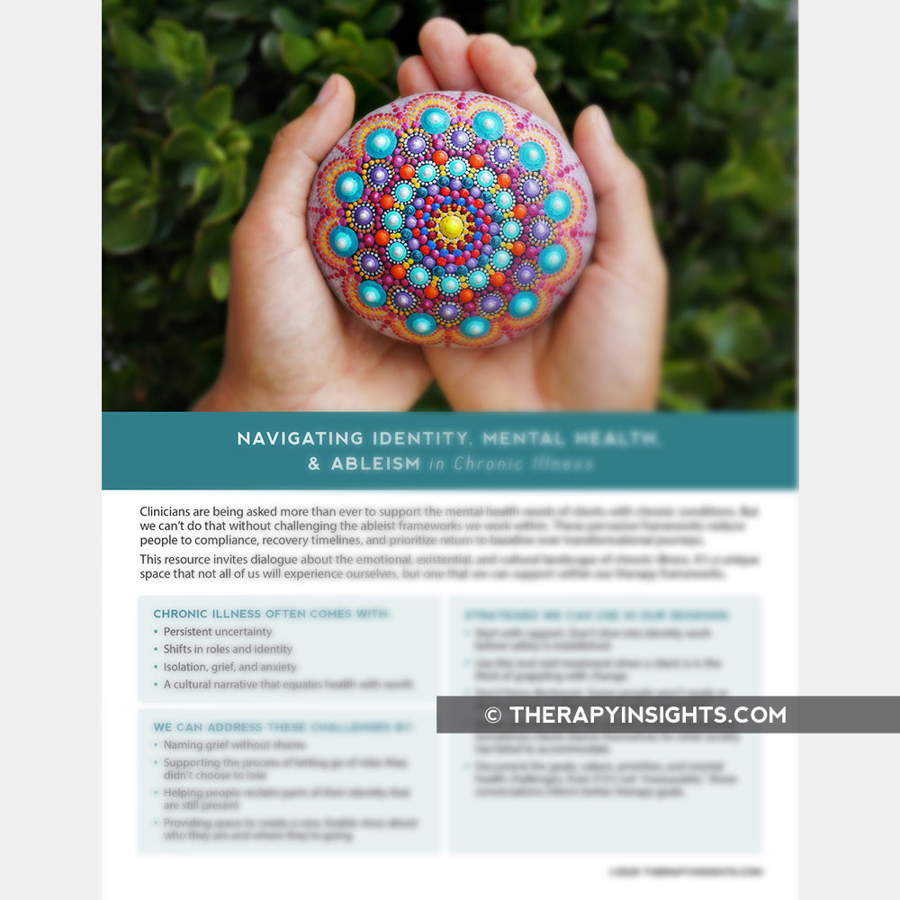 Mental HealthThis resource helps therapists initiate meaningful, person-centered conversations with clients navigating chronic illness, focusing on identity, emotional wellbeing, and the impact of ableism. Use it to support clients in mapping who they are beyond their diagnosis.