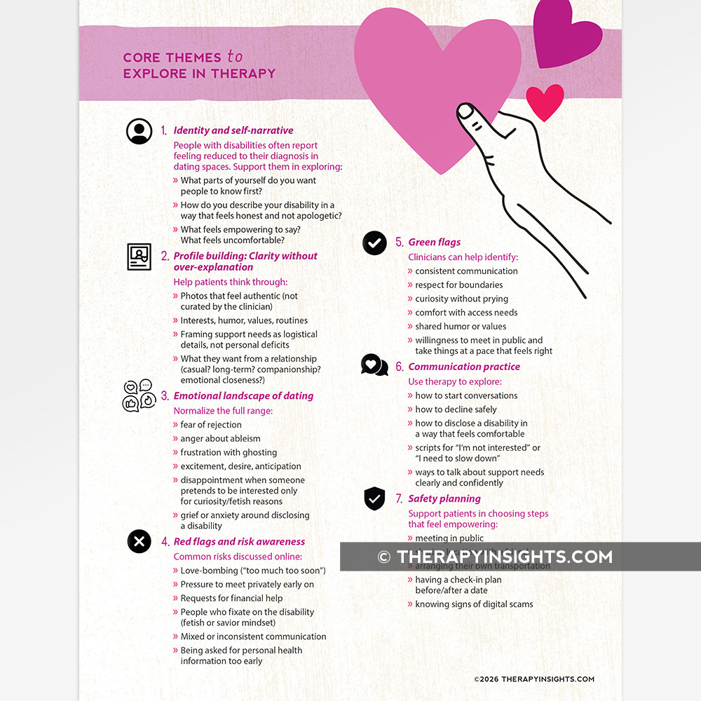 AgingBrain InjuryHealth Management and Self AdvocacyMotor Speech/Dysarthria/ApraxiaNervous System ConditionsProgressive Neurological ConditionsSpinal Cord InjuryStrokeThis resource provides a dual-purpose framework for therapists to facilitate dignified conversations about online dating with adults with disabilities. It balances clinical guidance on supporting autonomy without overstepping, paired with a practical planning tool to help clients navigate identity, boundaries, and safety in the digital dating world.