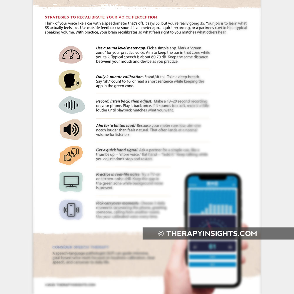 Progressive Neurological ConditionsHelp people with Parkinson’s make sense of why their voice feels loud but sounds soft. Use this in session to practice “loud enough” with a meter app and quick recordings, then send home simple carryover tips and an invitation to consider speech therapy.