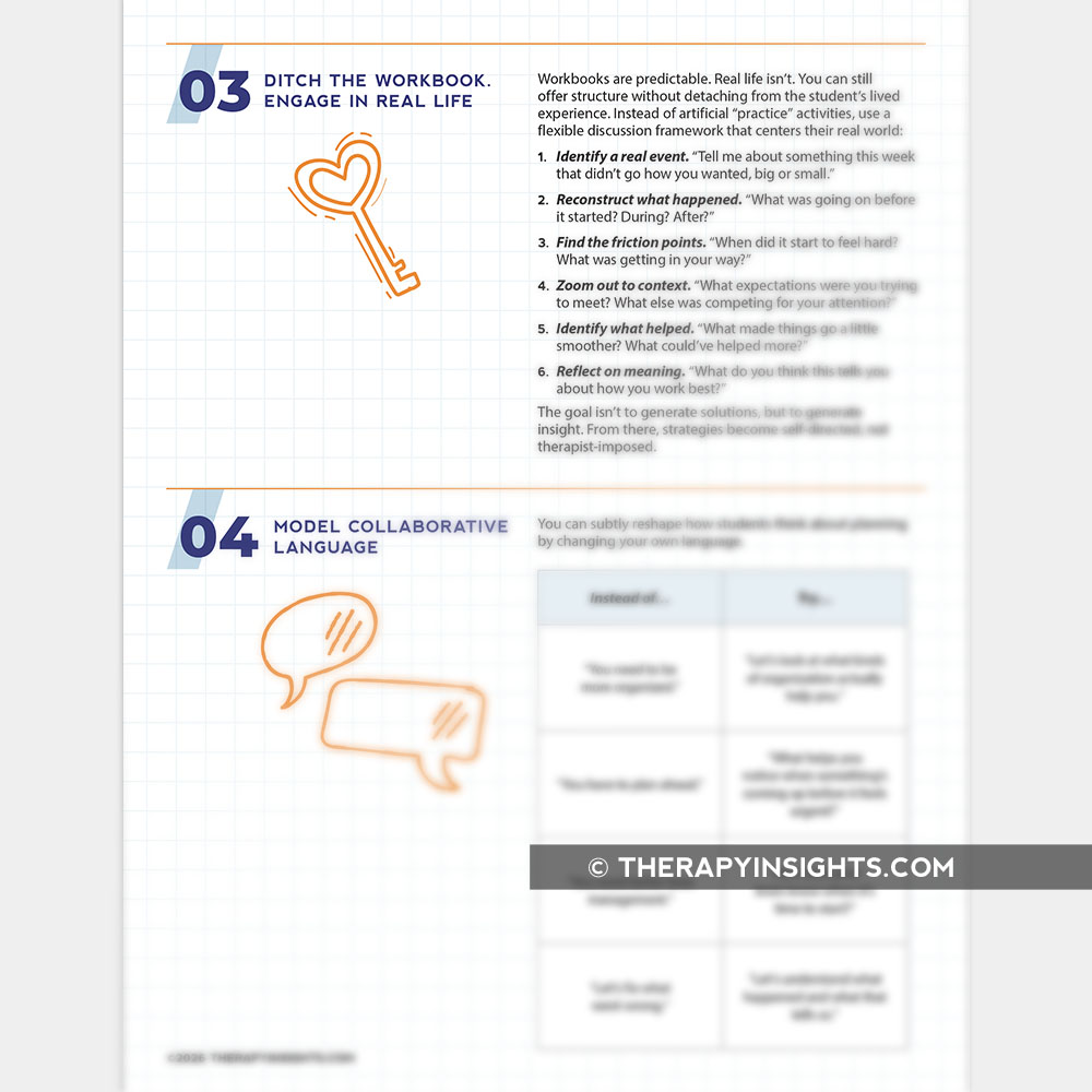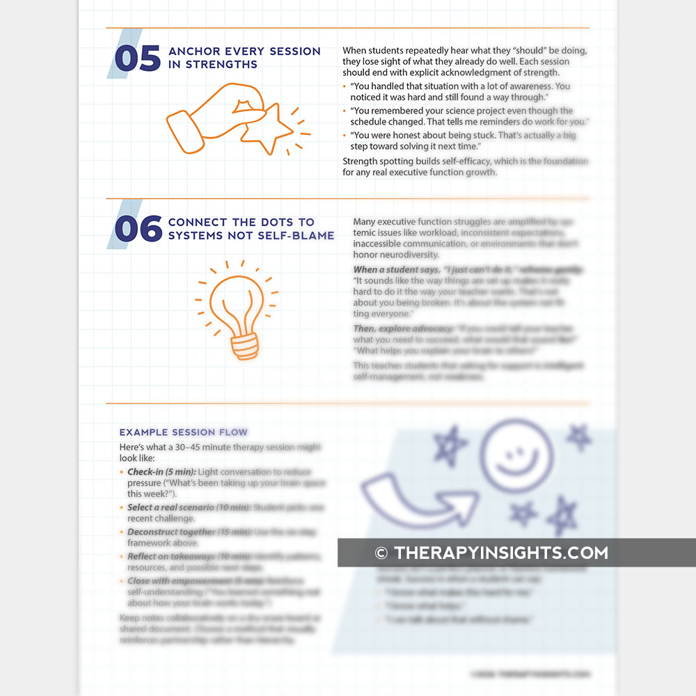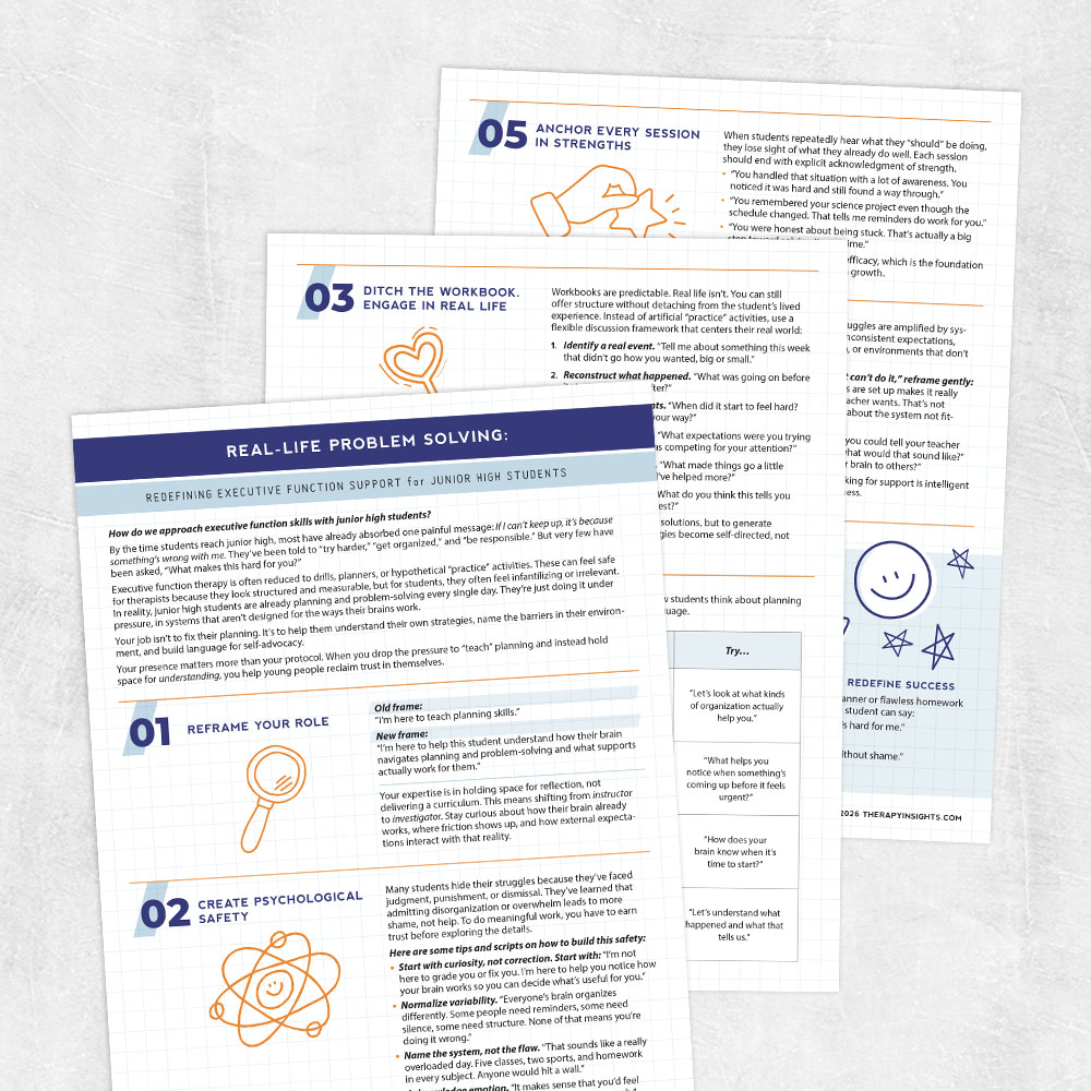 Executive FunctionThis guide helps therapists move beyond workbook-style executive function activities by engaging junior high students in real-world reflection about how they actually plan, organize, and problem-solve. It provides concrete language, conversation frameworks, and mindset shifts to create psychological safety, reduce shame, and build genuine self-understanding and advocacy.