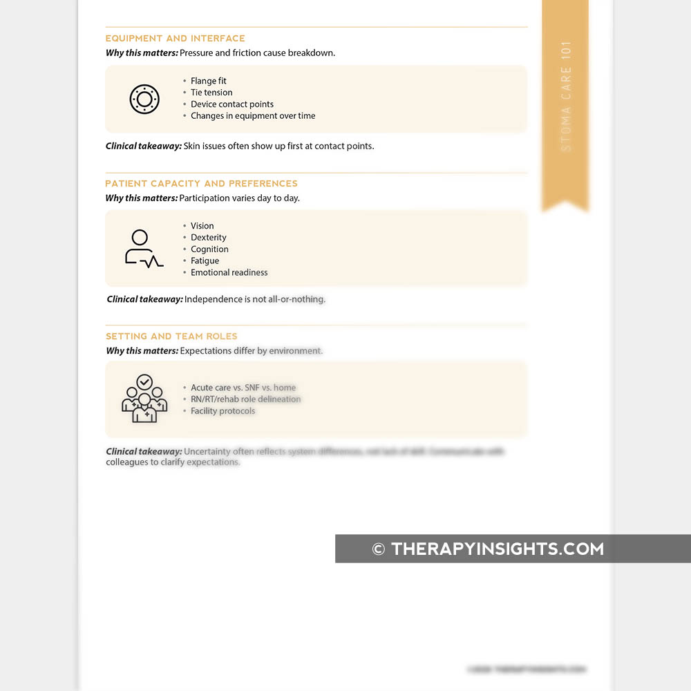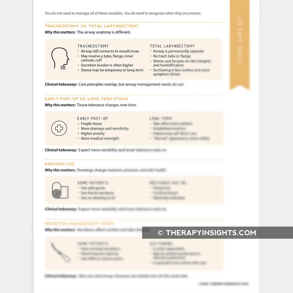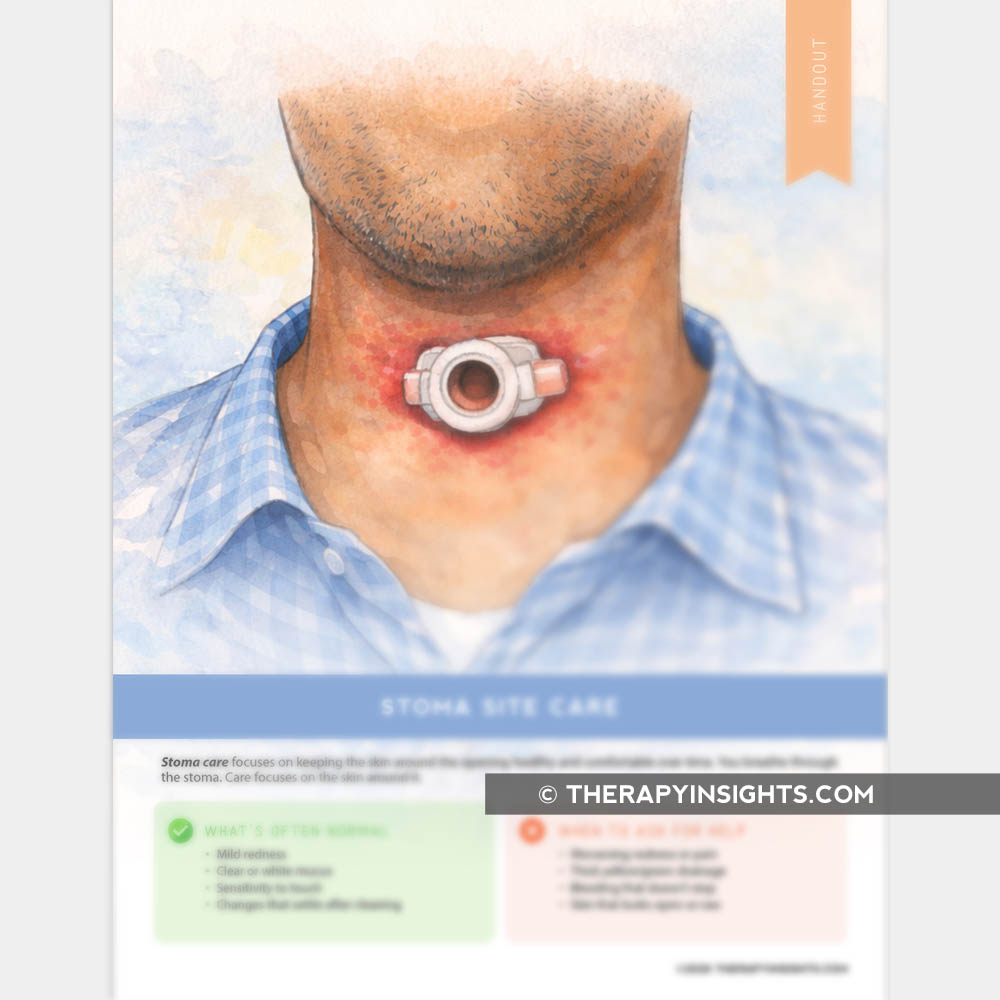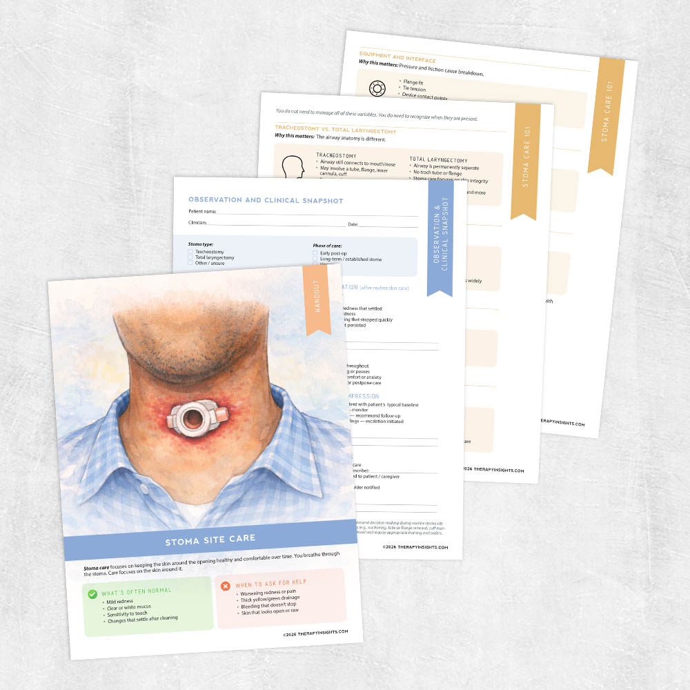 DysphagiaRespiratoryThis resource supports therapists in navigating stoma site care by focusing on understanding, observation, and respectful decision-making rather than rigid protocols. It’s meant to be used in therapy to help patients feel oriented to their bodies and help clinicians participate in care safely and confidently.