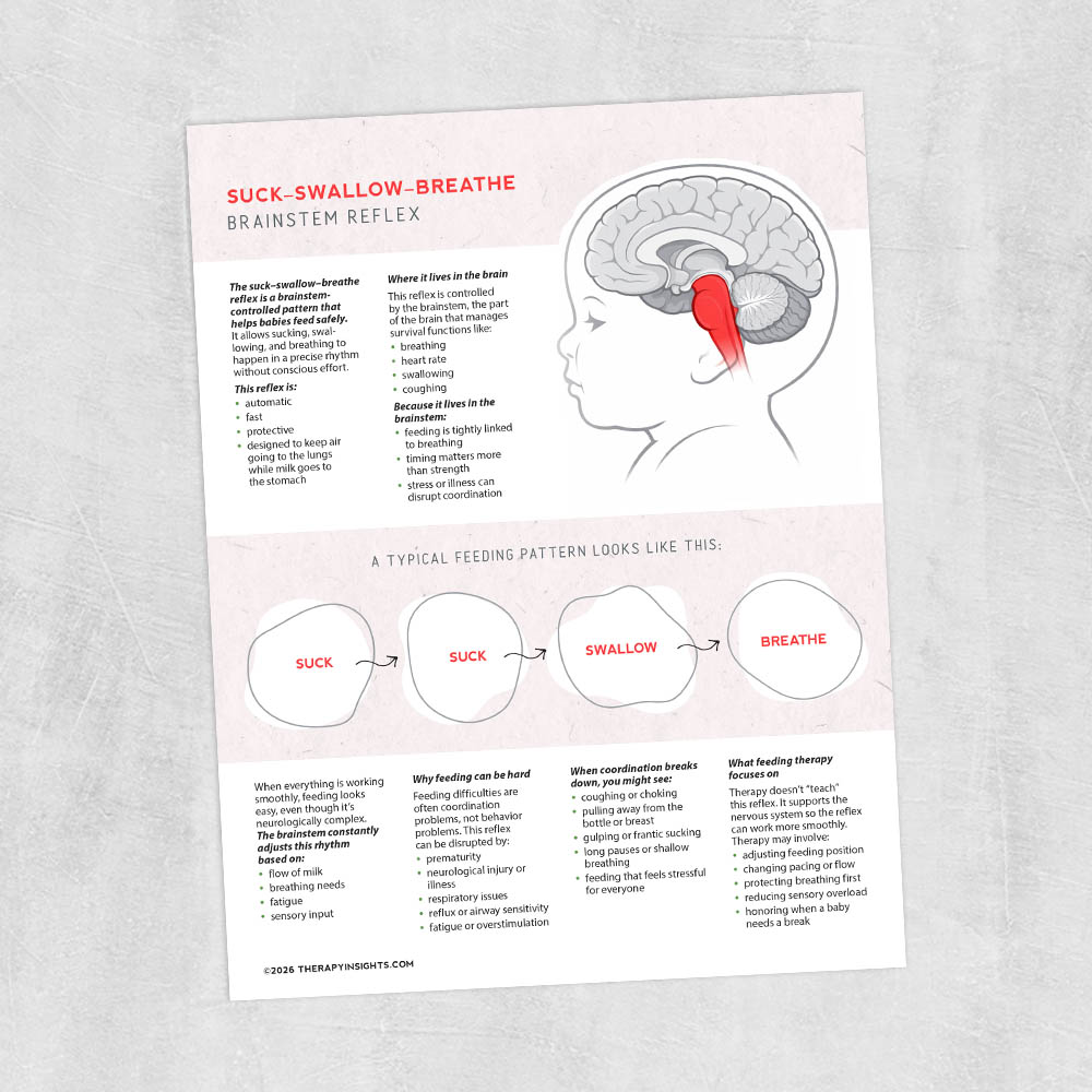 Feeding and SwallowingThis handout helps therapists clearly explain how the suck–swallow–breathe reflex is controlled by the brainstem and why feeding coordination can be disrupted. It gives clinicians a simple, visual way to normalize feeding challenges and support calm, informed conversations with families.