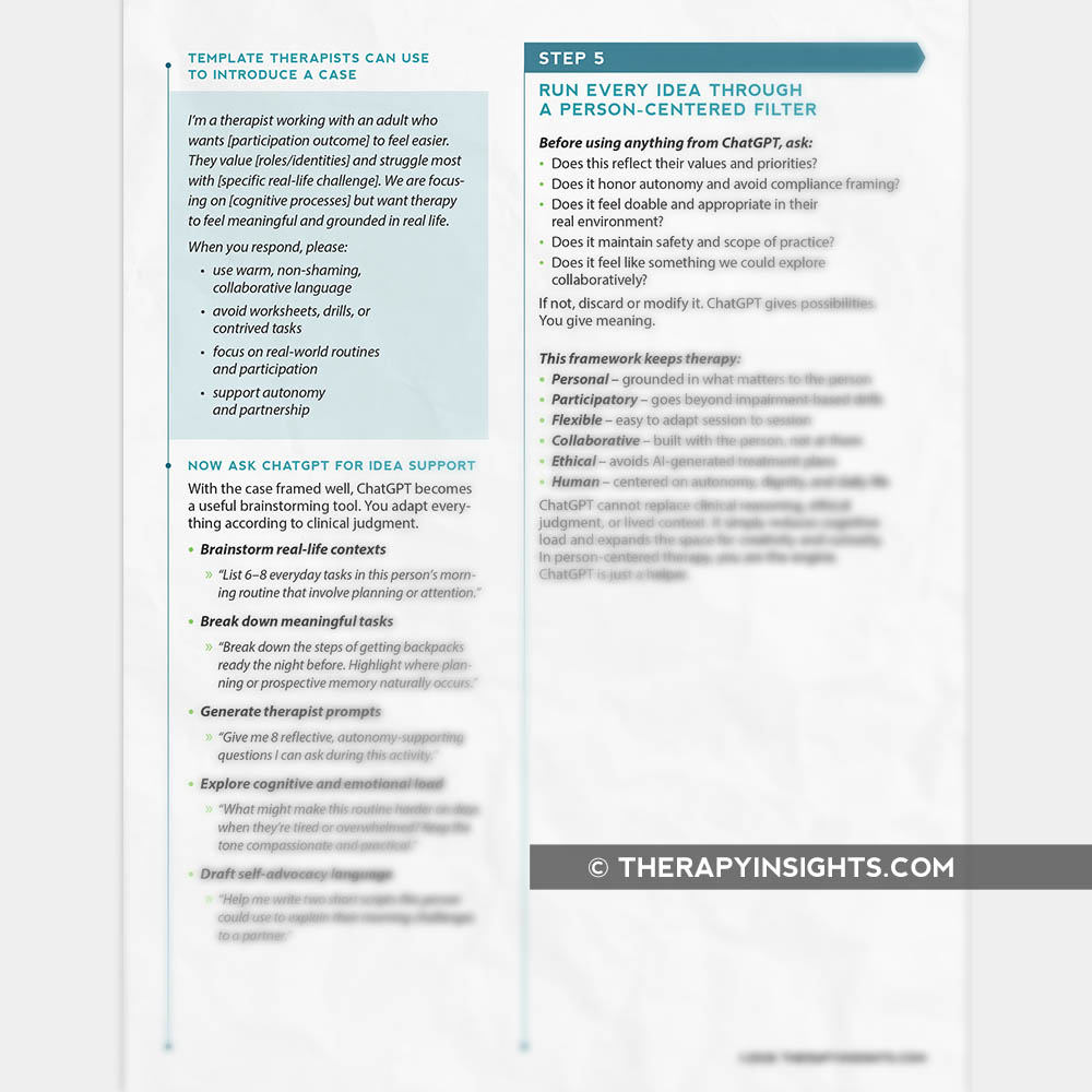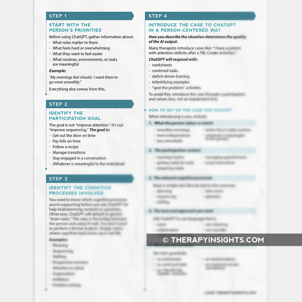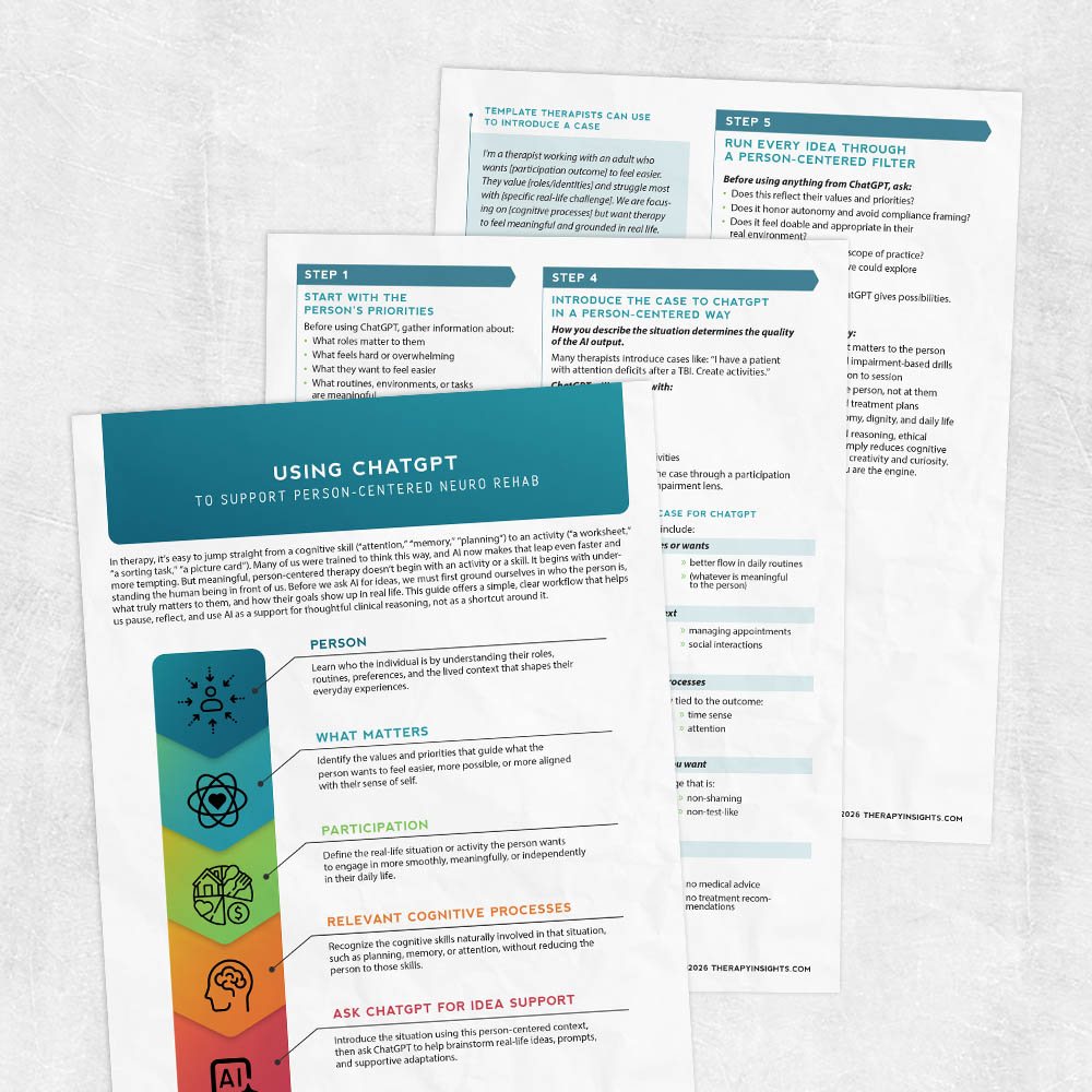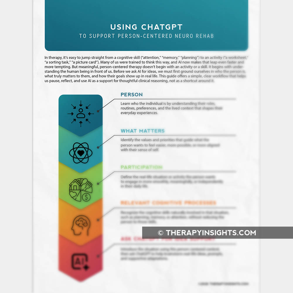 ADLs/IADLsAphasiaBrain InjuryDementiaDysphagiaMotor Speech/Dysarthria/ApraxiaNervous System ConditionsProgressive Neurological ConditionsSpinal Cord InjuryStrokeThis guide helps therapists use ChatGPT to support person-centered thinking rather than jumping straight from a cognitive skill to a generic activity. It offers a clear workflow that keeps therapy grounded in what truly matters to the person, using AI only to brainstorm meaningful, real-life ideas and questions.