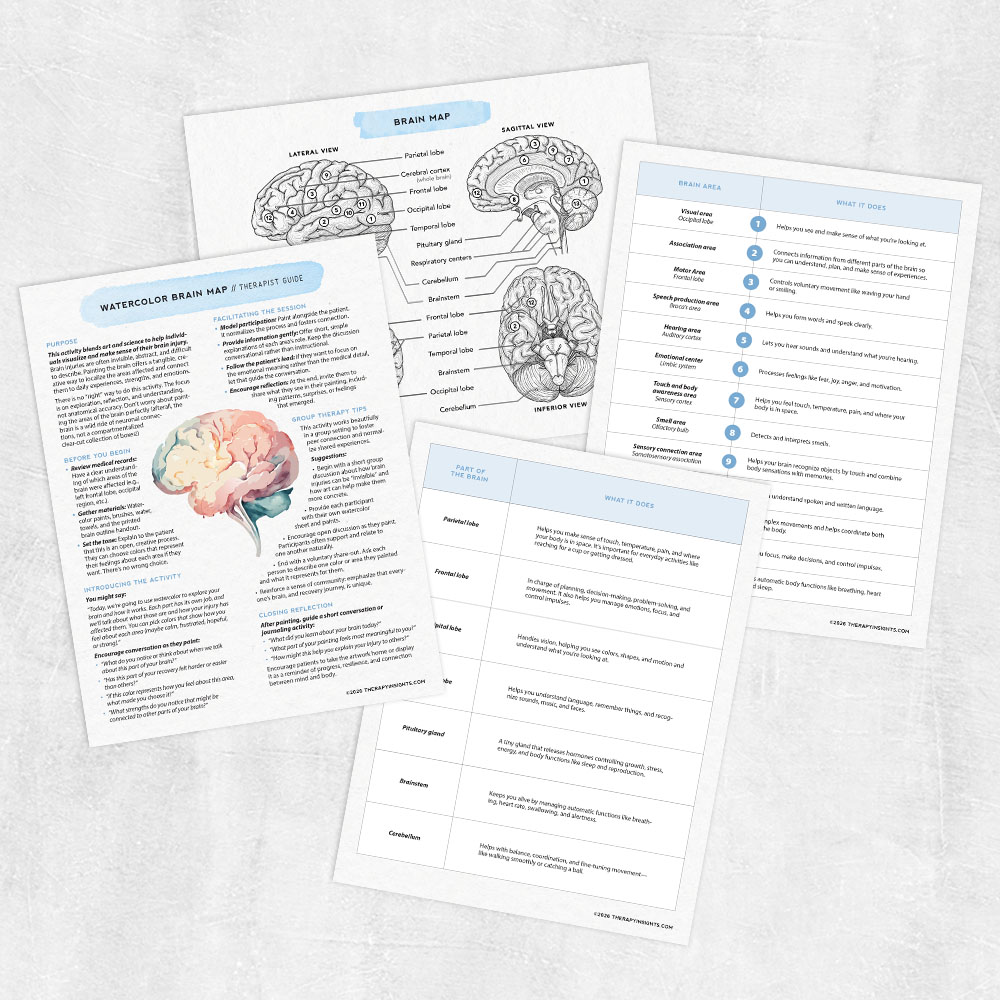 Brain InjuryStrokeHelp patients make sense of their injury by painting the parts of the brain and exploring how each area contributes to daily life. This art-meets-science activity turns something invisible into something tangible, inviting reflection, emotional connection, and deeper understanding during recovery.