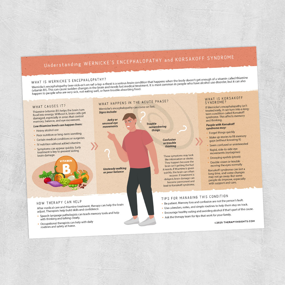 Brain InjuryThis one-page handout explains Wernicke’s encephalopathy and its progression to Korsakoff syndrome in clear, compassionate language for families. It’s a helpful tool for educating caregivers about what to expect and how therapy can support recovery alongside medical care.