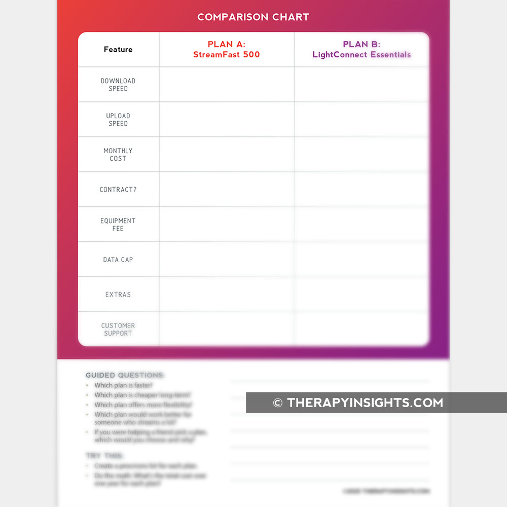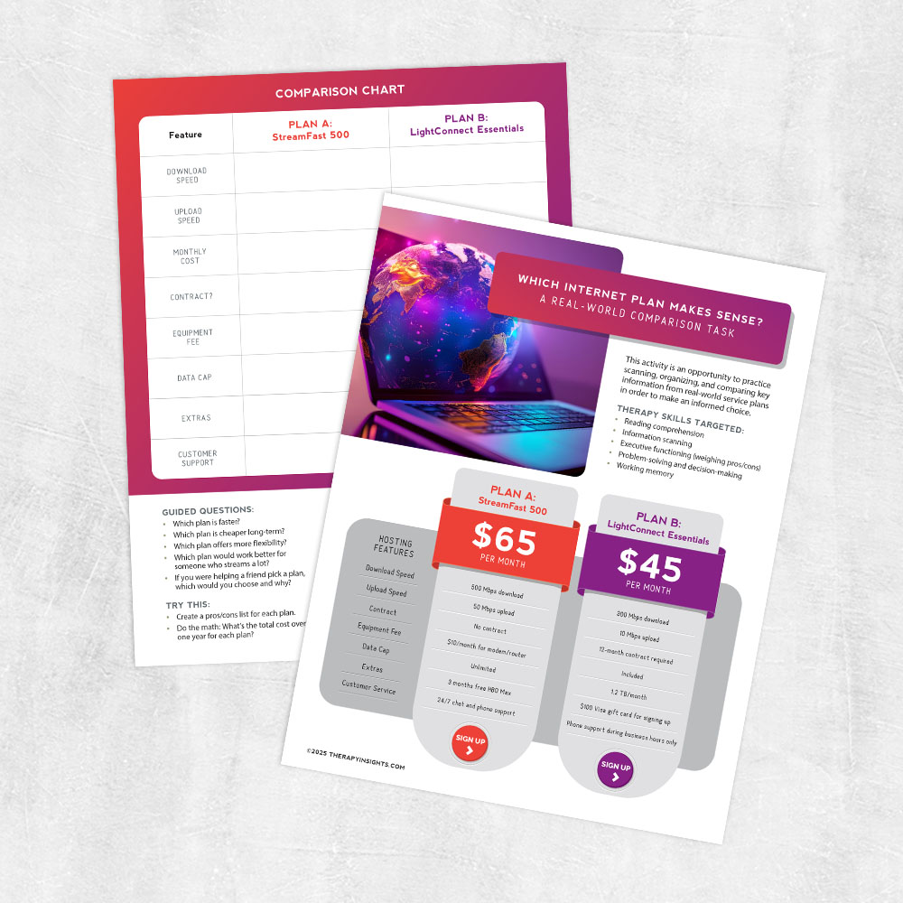 ADLs/IADLsBrain InjuryVisionThis real-world therapy activity invites clients to compare two modern internet plans, practicing scanning, comprehension, and decision-making skills.