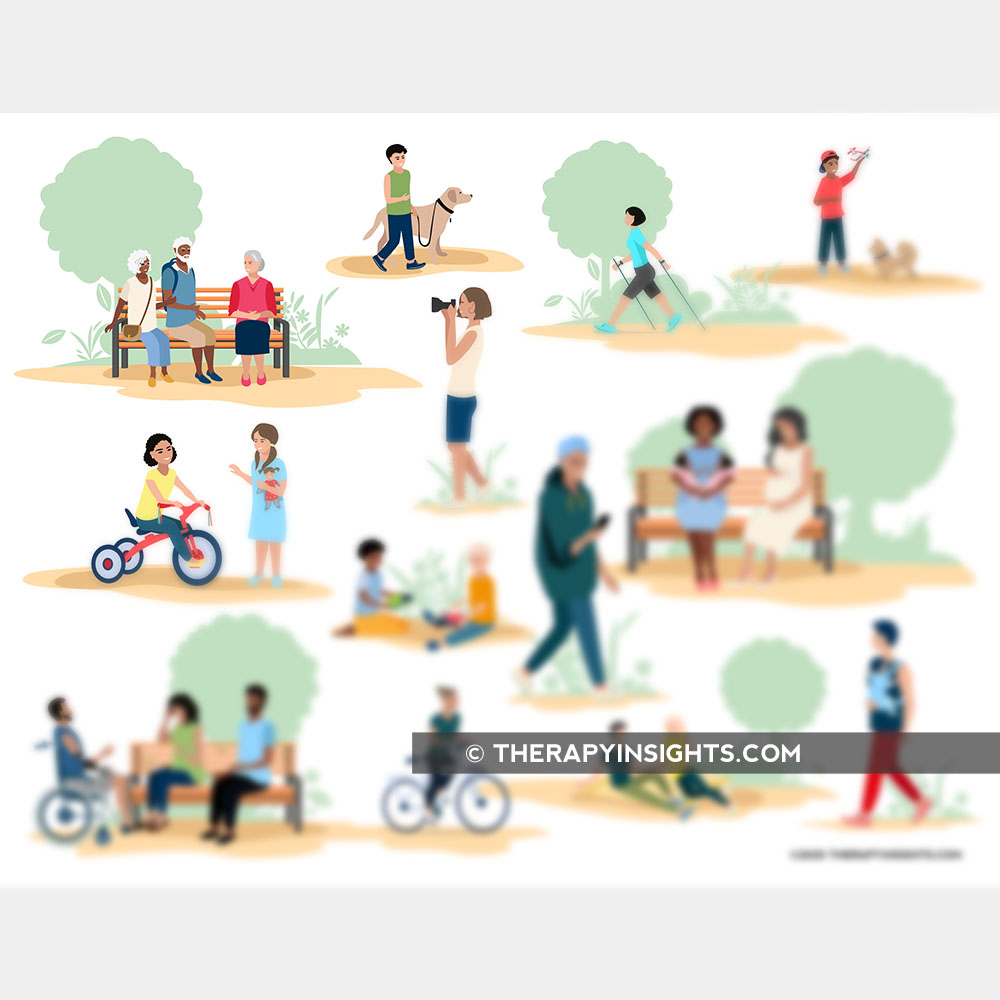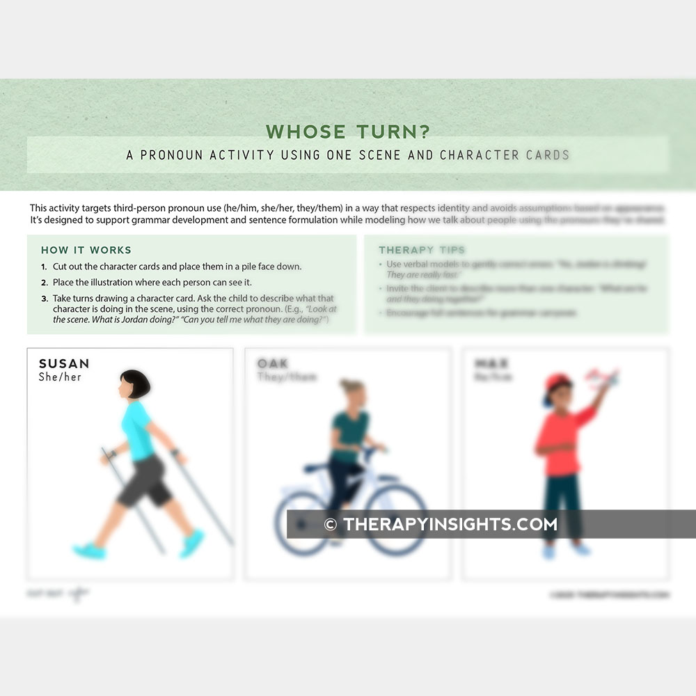 Language DevelopmentThis activity supports pronoun development using a park scene and character cards that state each person’s name and pronouns. Guide students to describe what each character is doing in the scene, building grammar skills while modeling respectful, identity-affirming language.