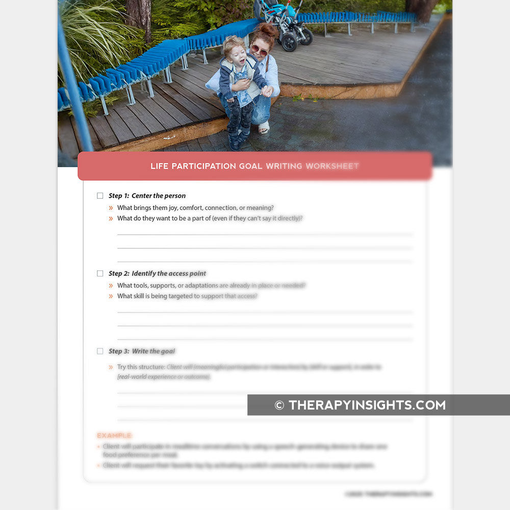 AACApraxia of SpeechAutismExecutive FunctionFeeding and SwallowingFluencyLanguage DevelopmentPediatric Brain InjuryThis resource helps therapists shift from impairment-driven goals to life participation goals that reflect what truly matters to the individual. It includes real-world goal examples and a worksheet to support writing goals that center autonomy, connection, and everyday engagement.