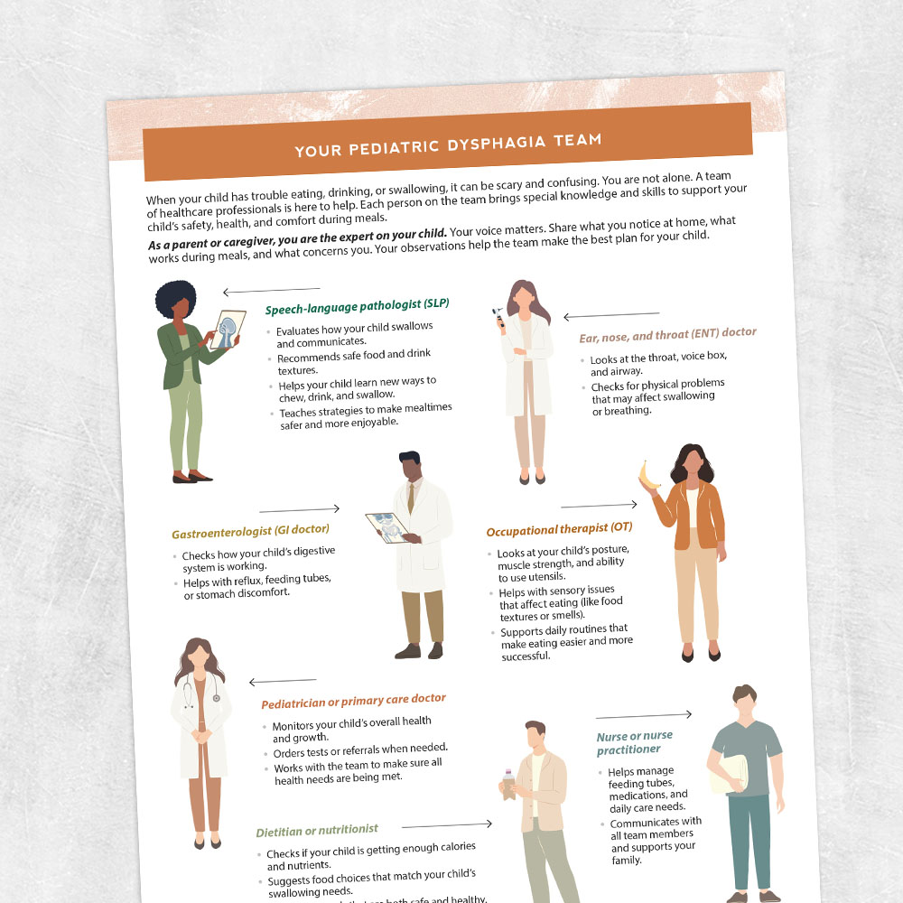 Feeding and SwallowingUse this quick reference to introduce families to each key player (SLP, OT, dietitian, pediatrician, GI, ENT, and nurse) and clearly explain how each contributes to safe, effective swallowing care.