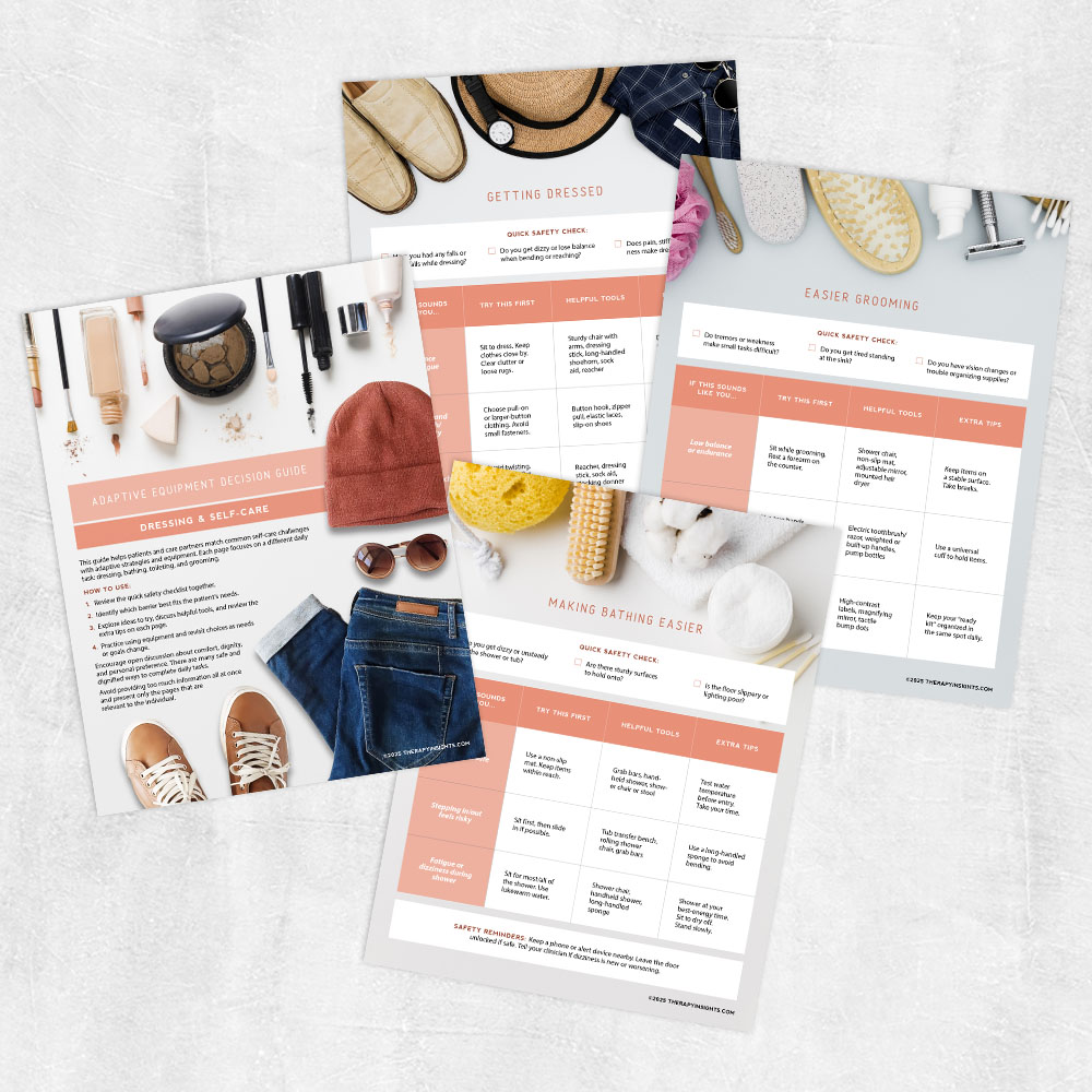 A practical guide that helps clients identify barriers and explore adaptive equipment for dressing, bathing, toileting, and grooming.