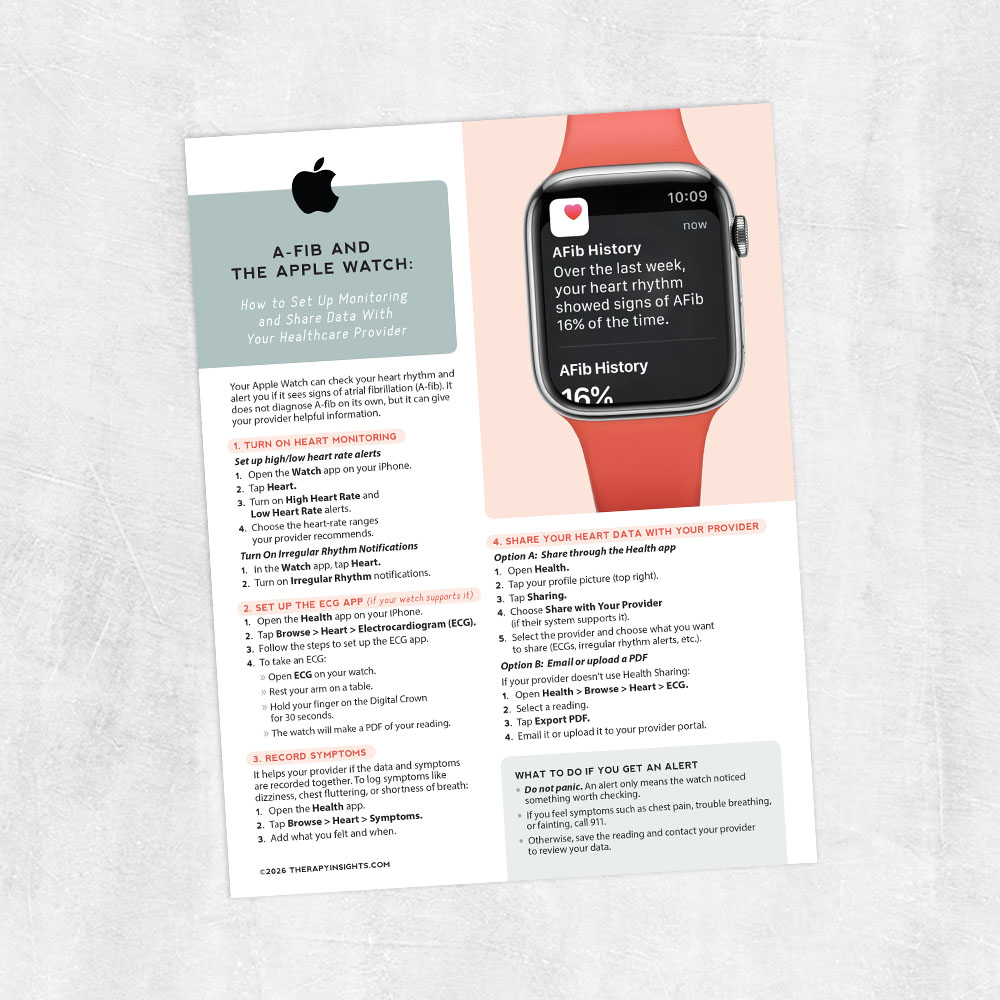 This step-by-step handout supports people in using their Apple Watch to monitor A-fib and share data with their care team. The focus stays on health literacy and independence, reinforcing the therapist’s role in supporting access and understanding rather than managing the medical condition itself.