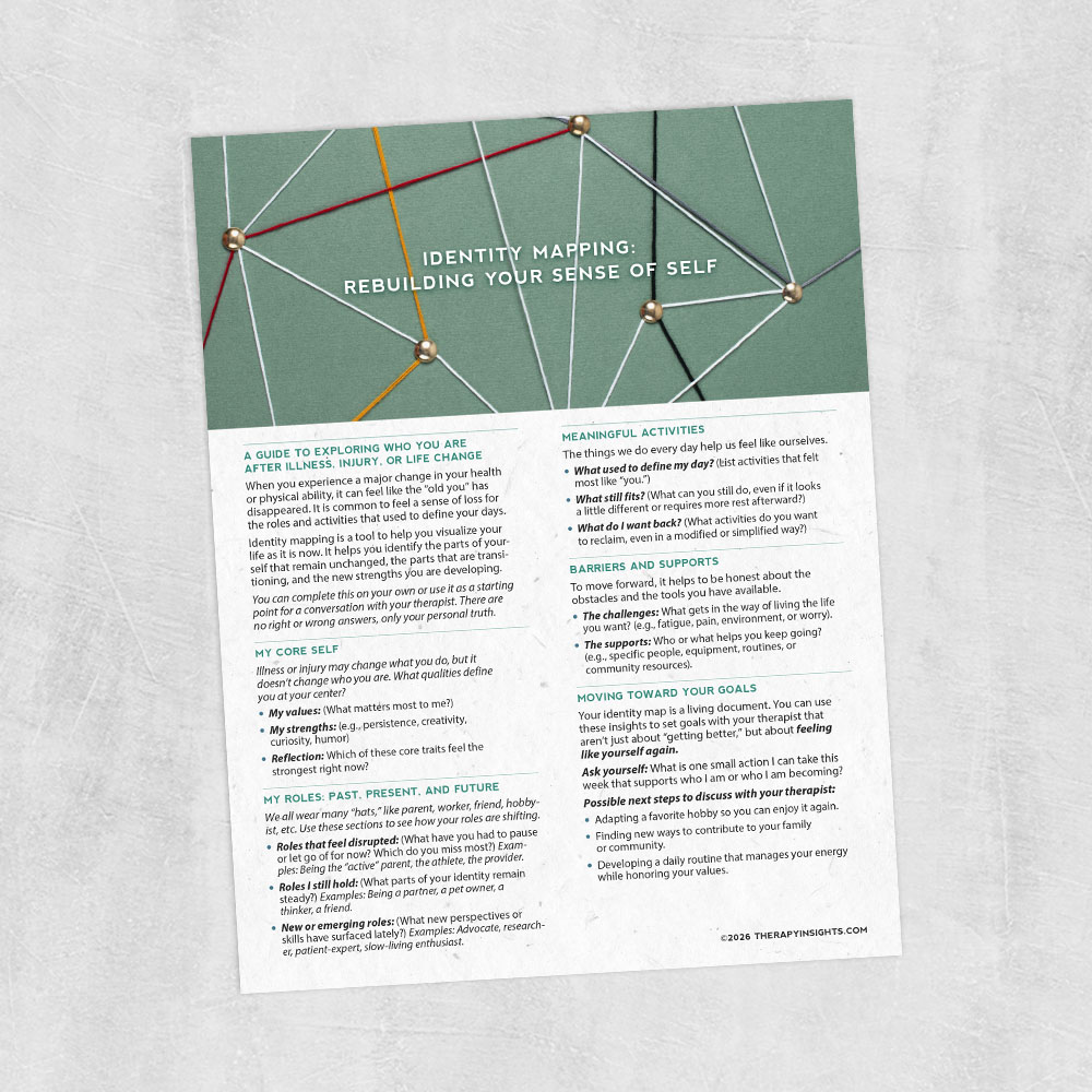 This Identity Mapping tool helps therapists guide people through the process of reclaiming and redefining who they are after illness, injury, or disability. By exploring shifting roles and core values, it offers a structured yet empathetic way to bridge who someone was with who they are becoming.